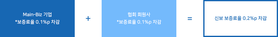 본 혜택은 신보 보증료 차감 규정에 따라 중복 차감은 불가며, 기존 Main-Biz 기업으로 인한 0.1%p차감을 받고 있는 경우에만 적용할 수 있습니다. 따라서 이용하시는 지점의 담당자를 통해 기업이 받고 있는 차감 퍼센트를 문의하시기 바랍니다.